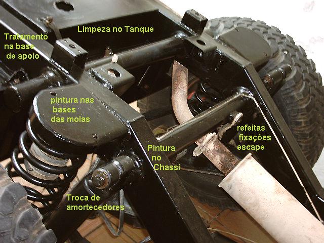 Foram retirados os parafusos que prendem a carroceria ao chassi e desconectada fiação de faróis , lanternas , sinalizações ... cabos de embreagem, acelerador , freio de mão , velocÃmetro , tubo de pressão de óleo ... como o jipe está na funeca do meu tio , eu mesmo soltei tudo e ajudei preparar algumas peças pra pintura , trouxe o chassi pra casa e desmontei tudo que está preso á ele pra limpeza e pintura e troca de algumas peças aproveitando a oportunidade como rolamento do garfo e chapéu chines da embreagem , coxins do motor , terminais , pitmam (era do Opala agora original) , alguns bicos graxeiros , parafusos e porcas suspeitas , amortecedores (F4000) , termostática .. , verificação dos garfos e engrenagens do câmbio ...