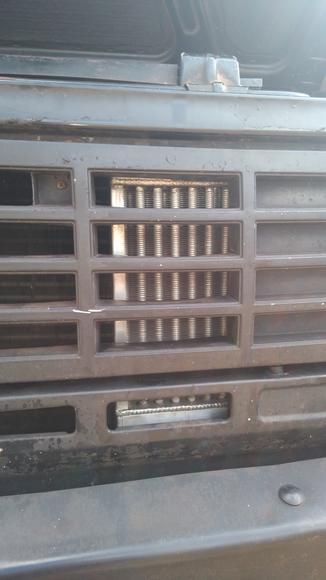 Detalhe do radiador da transmissão atras da grade.