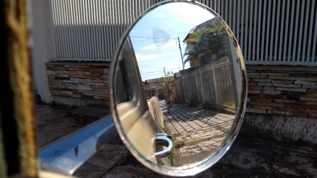 Tirei umas fotos pra vcs verem meu campo de visão com as lentes de moto.lado direito e lado esquerdo.o retrovisor da Suzuki intruder é perfeito.paguei 30 conto no desmanche.