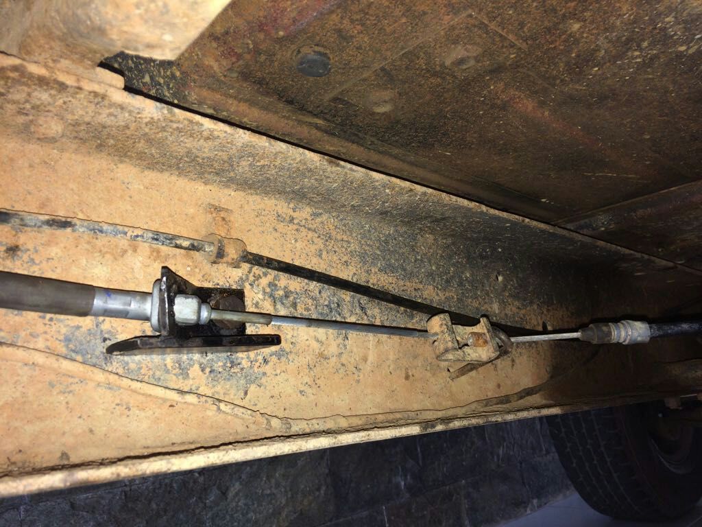 freio de mao adaptado funcionando;usei os dois cabos originais da s10 saindo das rodas,confeccionei dois suportes para passagem dos cabos e ancoragem das capas ,usei um cabo traseiro de roda,pra fazer a ligação entre os dois da s10;fiz um guia de de passagem do cabo naquele ferrolho fixo da carroceria e uma chapa de uns 10 com puxando o conjunto traseiro e fixando no cabo do manete da cabine.