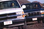 Chevrolet Silverado retoma disputa com a Ford F-1000, uma velha briga agora com novos modelos a gasolina. O recente lançamento da Chevrolet, a Silverado, traz de volta uma briga que estava até esquecida entre as pickups grandes ("full size"), ambas agora feitas na Argentina, nacionalizadas via Mercosul. De aparência robusta e agressiva, a nova linha Silverado, que substitui a antiga Série 20 (A20, C20 e D20), tem pela frente uma forte concorrente, a Ford F-1000. Além das versões com motor a diesel, turbo ou aspirado, as duas pickups dispõem de versões a gasolina com potentes motores de seis cilindros em linha. MECÂNICA comparou esses utilitários da Chevrolet e da Ford: a Silverado traz projeto mais atual, melhor desempenho e consumo, apesar de a F-1000 ter maior torque e potência que a concorrente, segundo dados dos fabricantes. A F-1000 XLT, um pouco mais potente, usa motor fabricado nos Estados Unidos de 4.913 cc (o mesmo das atuais pickups norte-americanas F-150 e F-250), de 148 cv de potência a 3.500 rpm e 34,5 Kgfm de torque a 2.400 rpm. Já a Silverado DLX é equipada com o conhecido motor de 4.1 (de 4.093 cc), já usado pelo Opala e mais recentemente pelo Omega, que agora foi atualizado com a adoção de injeção multiponto sequencial e ignição estática, passando a desenvolver 138 cv de potência a 4.100 rpm e 30,7 kgfm de torque a 2.500 rpm. Com a modernização do motor, a Silverado consegue ser mais rápida que a Ford em aceleração fazendo de 0 a 100 km/h em 13 segundos, contra 13,78 segundos da F-1000. Em velocidade máxima a vantagem novamente é da Silverado que chega aos 160 km/h e a F-1000 aos 155,5 km/h, segundo os fabricantes. A caixa de transmissão de cinco marchas sincronizadas das duas pickups usam tecnologias bem diferentes. A da Ford, também importada dos Estados Unidos, é fabricada pela Mazda, com carcaça totalmente em alumínio, de cinco marchas sincronizadas e embreagem incorporada para diminuição de peso. A Silverado usa transmissão brasileira da Eaton com dentes mais estreitos e tem menor ruído de trabalho porém, por ser de maior tamanho, ocupa grande espaço inclusive no assoalho e a quinta marcha é difícil de ser desengatada. Em ambas, a marcha a ré também é sincronizada e a quinta é do tipo overdrive, uma sobremarcha para economia de combustível e menor nível de ruídos internos. O consumo de combustível não é um item favorável a nenhuma das duas pickups, mas é o preço que se paga pela potência do motor. Apenas com o motorista e sem levar nenhuma carga, a F-1000 consegue fazer média de 4,3 km/litro na cidade e 7,3 km/litro na estrada, enquanto a Silverado chega a 5,9 km/litro quando roda na cidade e 7,9 km/litro em percursos rodoviários, de acordo com os fabricantes. Mesmo com consumo elevado, as duas conseguem boa autonomia média já que usam tanques de combustível de grande capacidade, de 110 litros na F-1000 e 126 litros na Silverado. Apesar da diferença de potência e torque de motor e ainda do volume da caçamba (1.680 litros na F-1000 e 1.521 litros na Silverado) serem favoráveis à pickup da Ford, a nova Silverado, no entanto, tem maior capacidade de carga em peso, podendo transportar até 1.200 kg de carga útil, contra 1.150 kg da F-1000. Internamente, a vantagem é toda da Silverado. Por ser mais moderna, ela oferece melhor aproveitamento do espaço, além de uma série de itens de conforto de série que não estão disponíveis nem mesmo como opcionais na F-1000, como o duplo porta-copos de embutir, outros dois apoios para copos sobre o porta-luvas, duas tomadas de força, e ainda acendedor de cigarros (para ligação de telefone celular ou outros aparelhos), cintos de segurança de três pontos com regulagem de altura e direção hidráulica de assistência variável, todos esses equipamentos até então só encontrados em automóveis de passeio. Mas existem outras vantagens na Silverado. Seus comandos estão todos bem localizados, caso dos interruptores dos vidros elétricos e espelhos retrovisores no apoio de braço das portas. Na F-1000, os interruptores também ficam nas portas, mas muito abaixo do braço do motorista, obrigado a se abaixar para a simples abertura de um vidro, o que além de incômodo, compromete a segurança. A posição adequada de dirigir é mais facilmente encontrada na Silverado, principalmente pela coluna de direção regulável em altura. A chegada da Silverado ofuscou o visual até então agressivo e arrojado da F-1000, já que havia passado por uma série de modificações em 1996, ganhando grade do radiador, conjunto ótico e pára-choques idênticos aos dos modelos americanos. Nos Estados Unidos, a Silverado não é nenhuma novidade, mas sua chegada ao Brasil inovou o design das pickups grandes, já que tem linhas um pouco mais arredondadas, bem diferentes da antiga Série 20 e da própria Ford F-1000. Em tamanho, as duas pickups praticamente se equivalem, sendo que a principal diferença fica por conta da maior largura da Silverado. A F-1000 tem 5,0 m de comprimento, 2,0 m de largura e 1,78 m de altura, e a Silverado, 4,94 m de comprimento, 2,2 m de largura e 1,86 m de altura. A distância entre-eixos e bitola também são quase idênticas. Mas um dos itens mais importantes é o preço de cada uma dessas pickups. A Chevrolet Silverado DLX tem preço de R$ 27.850, enquanto a Ford F-1000 XLT custa R$ 29.504, ambas em suas versões básicas, sem nenhum equipamento opcional instalado. Origem A história das pickups é antiga, ela começou na verdade na década de 30, quando alguns fabricantes passaram a adaptar seus carros de passeio para entregas rápidas e leves, onde não se justificava o uso de um caminhão. Já na década de 40, com o crescente mercado dos carros adaptados, as pickups já não eram mais derivadas de automóveis, parecendo-se mais com pequenos caminhões. A partir daí, as pickups ganharam um segmento próprio, que cresce a cada ano. A década de 80 